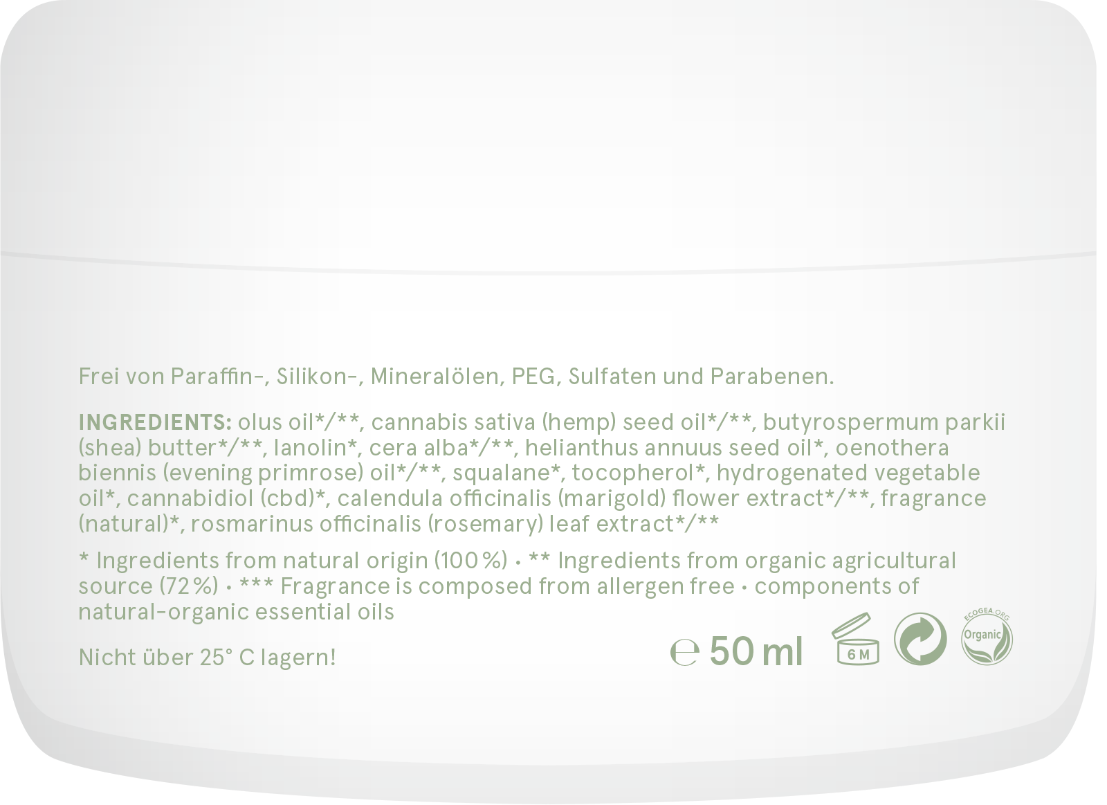 Inhaltsstoffkomplex: Cannabidiol (300 mg), Hanfsamenöl, Sonnenblumenöl, Nachtkerzenöl, Ringelblumenextrakt, Squalane, Rosmarinextrakt, Vitamin E